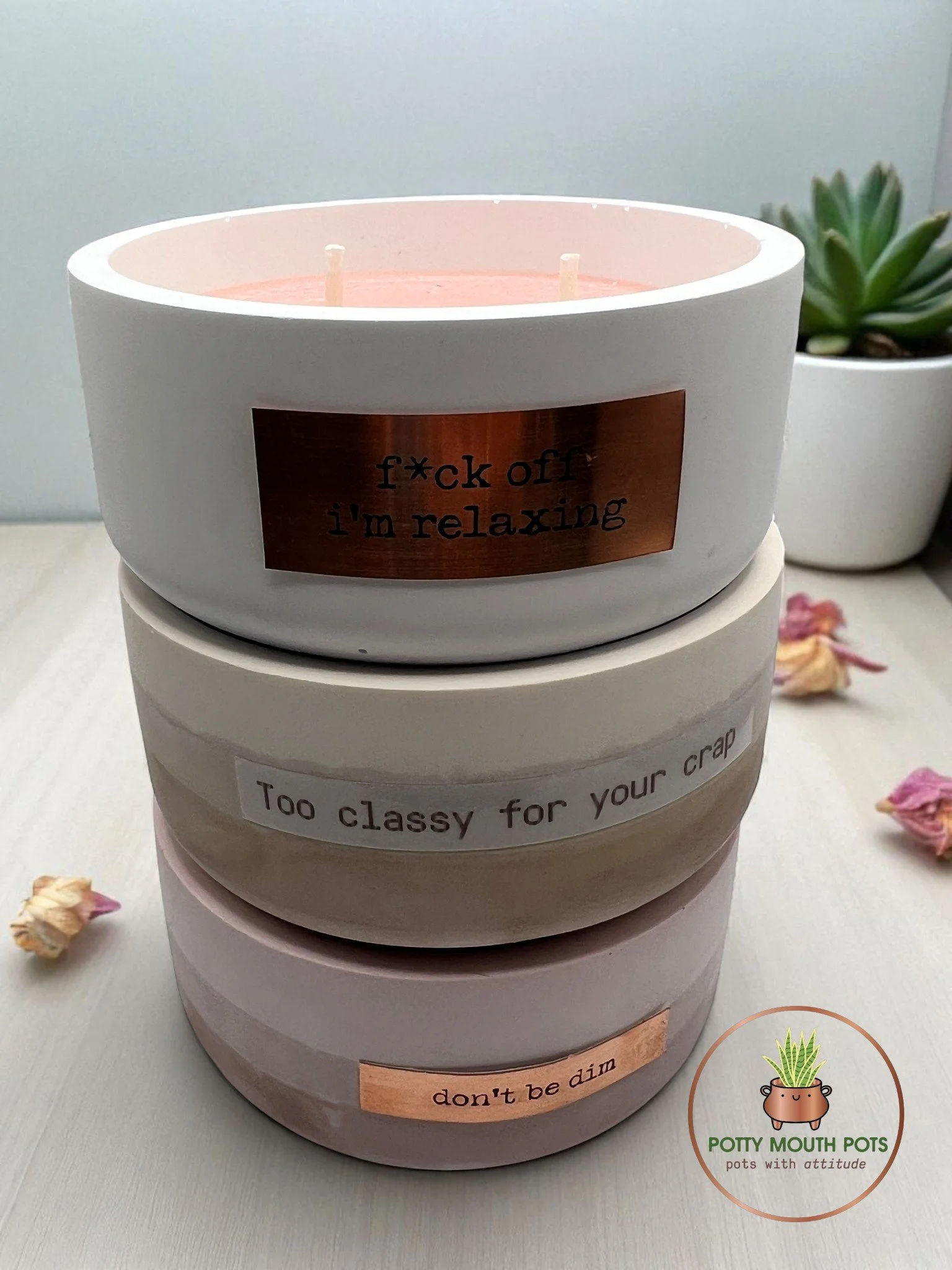 Quick View Large plant pot - Leaf me alone £14.00 Quick View Large plant pot - Therapy but cheaper £14.00 Quick View Large plant pot - Dear Santa £14.00 Quick View Large plant pot Less people more plants £14.00 Quick View Medium bowl Dont be dim with soy candle £16.00 Quick View Medium bowl Sage £12.00 Quick View Medium bowl Natural - Too classy for your crap £12.00 Quick View Medium bowl Strawberry - Don't be dim £12.00 Quick View Trinket/tealight pot stone grey £7.00 Quick View Trinket/tealight pot raspberry £7.00 Quick View Trinket/tealight pot pink white £7.00 Quick View Trinket/tealight pot natural £7.00 Sold Out Quick View Trinket/tealight pot Pink green £7.00 Quick View Trinket / tealight pot Pink Chocolate £7.00 Quick View Large tealight holder Stone £16.00 Quick View Large tealight holder Strawberry £16.00 Quick View Large tealight holder Sage £16.00 Quick View Large tealight holder blue white £16.00 Quick View Medium wave candle pot Aqua white £14.00 Quick View Medium wave candle pot Strawberries and cream £14.00 Quick View Medium wave candle pot Natural £14.00 Quick View Medium Wave candle pot Raspberry £14.00 Quick View Medium Wave Candle Pot Grey/Blue £14.00 Quick View Small Tealight Holder £6.00 Quick View Small penis - guaranteed to be harder than the real thing. £5.00